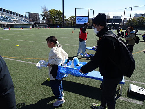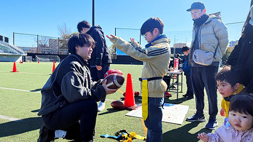 川崎市に本拠地を置く、社会人アメリカンフットボールチーム「OrientalBioシルバースター」の選手と一緒に備蓄品を覚えるパス&タッチダウンを体験!!