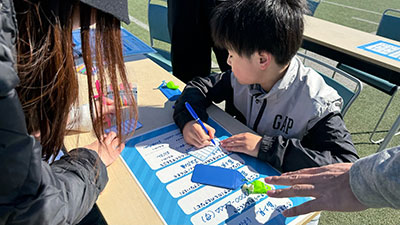 防災の知識を身に付けるためのクイズを解く川崎フロンターレアンサーシュート。