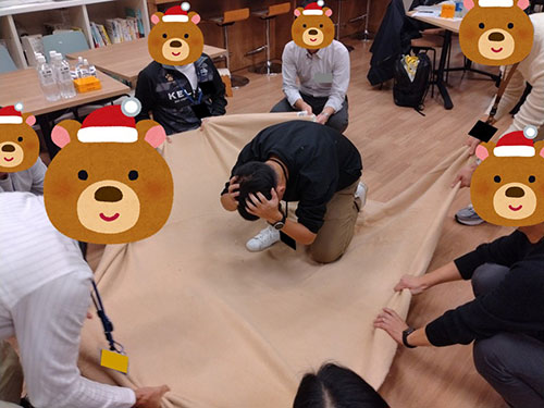 毛布を使用した地震体験のコーナーです。大地震の時、身の安全を図ることは知っていますよね。